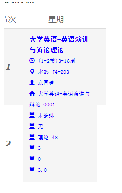 选完后会出现在学生课表里面,学生可以通过“学生课表查询”来查看是否选课成功(如下图)。