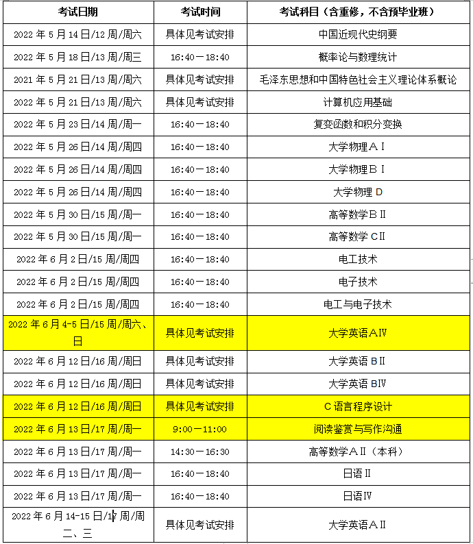 1.通识教育必修课程和面向部分学院开设的学科基础课程的考试时间安排表如下表(详见附件2),如课程安排与考试时间冲突,优先参加课程考试。